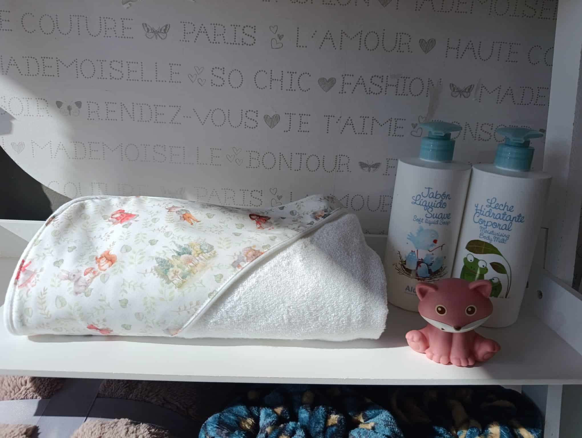 Incluye una capa de baño artesanal, confeccionada en nuestro taller con una mezcla de bambú y algodón, más suave y absorbente que el algodón tradicional. Su textura delicada es perfecta para envolver al bebé tras el baño, mimando incluso las pieles más sensibles.