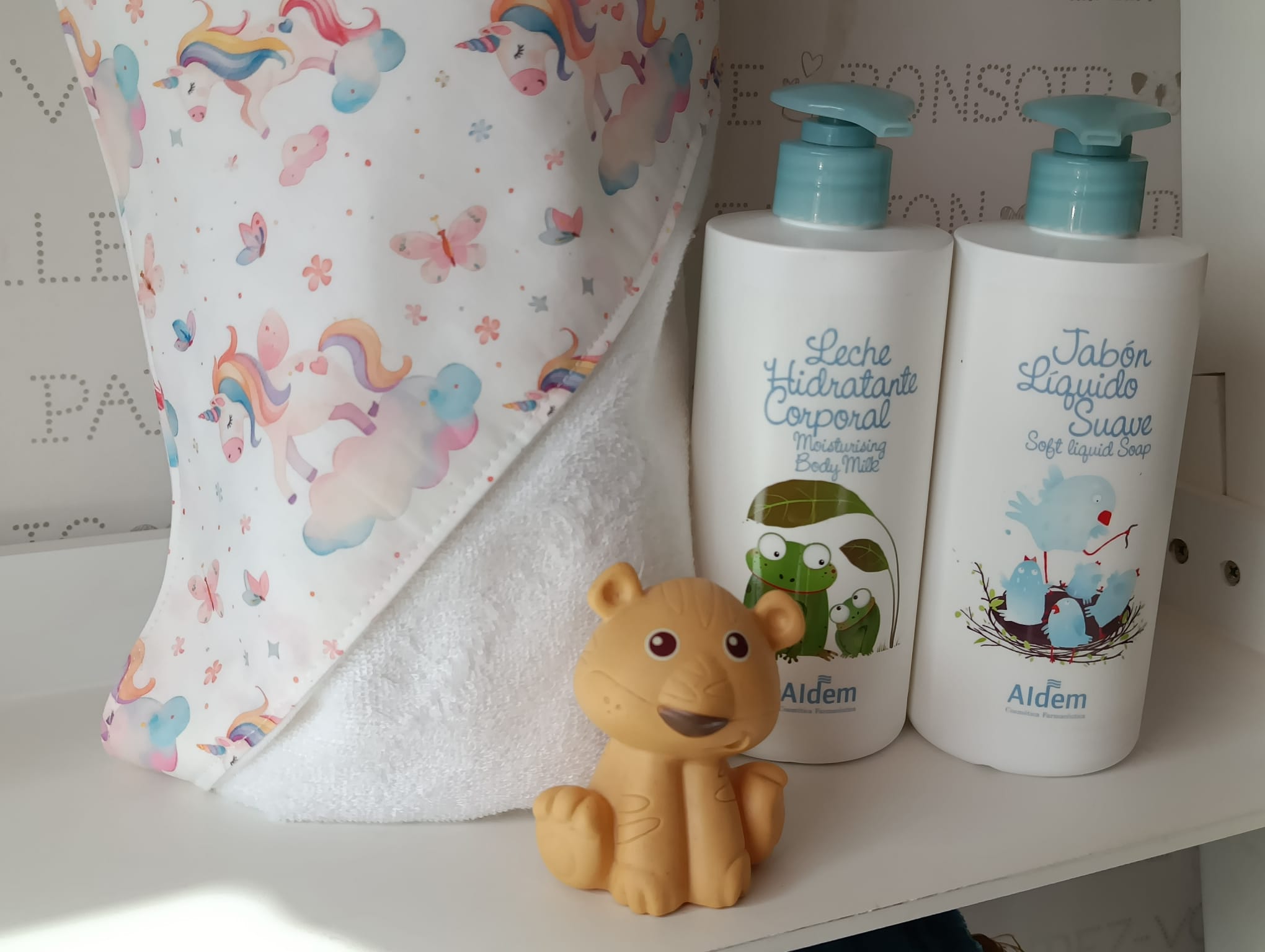 La Canastilla Básica Baño Unicornio es el regalo ideal para bebés: suave, práctica y llena de magia. Incluye una capa de baño de bambú y algodón, gel y crema Aldem para pieles sensibles y un juguete de baño anti-moho.