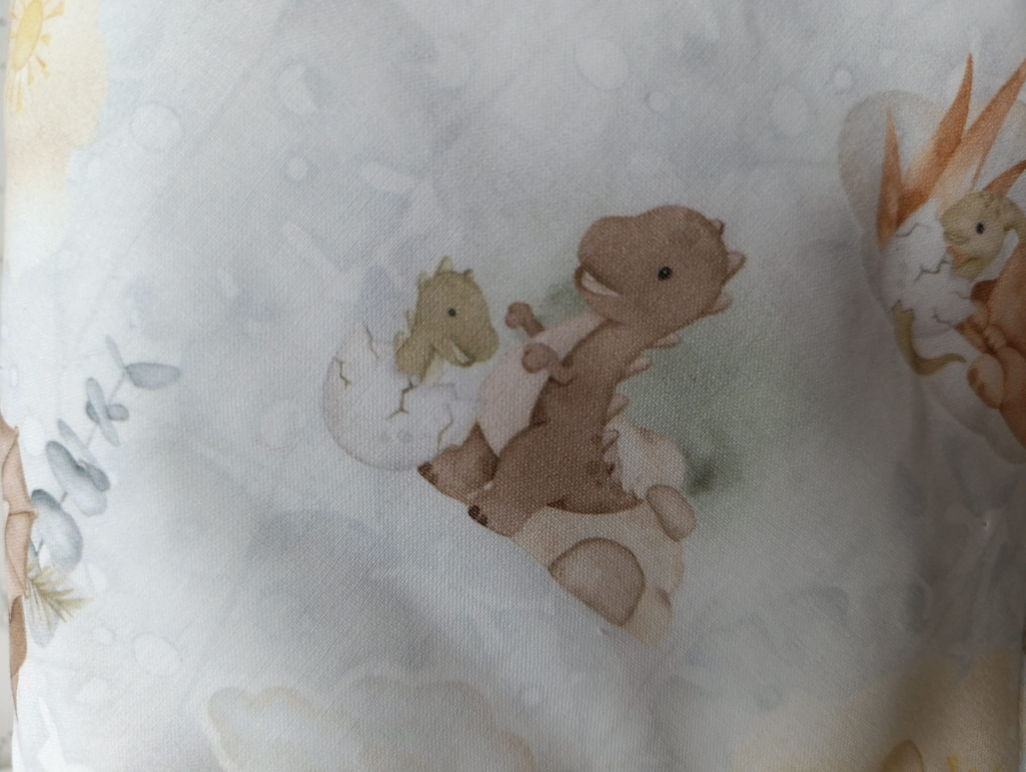 Incluye una manta artesanal personalizada y un dou dou dinosaurio a juego, confeccionados con tejidos suaves, seguros y de gran calidad.