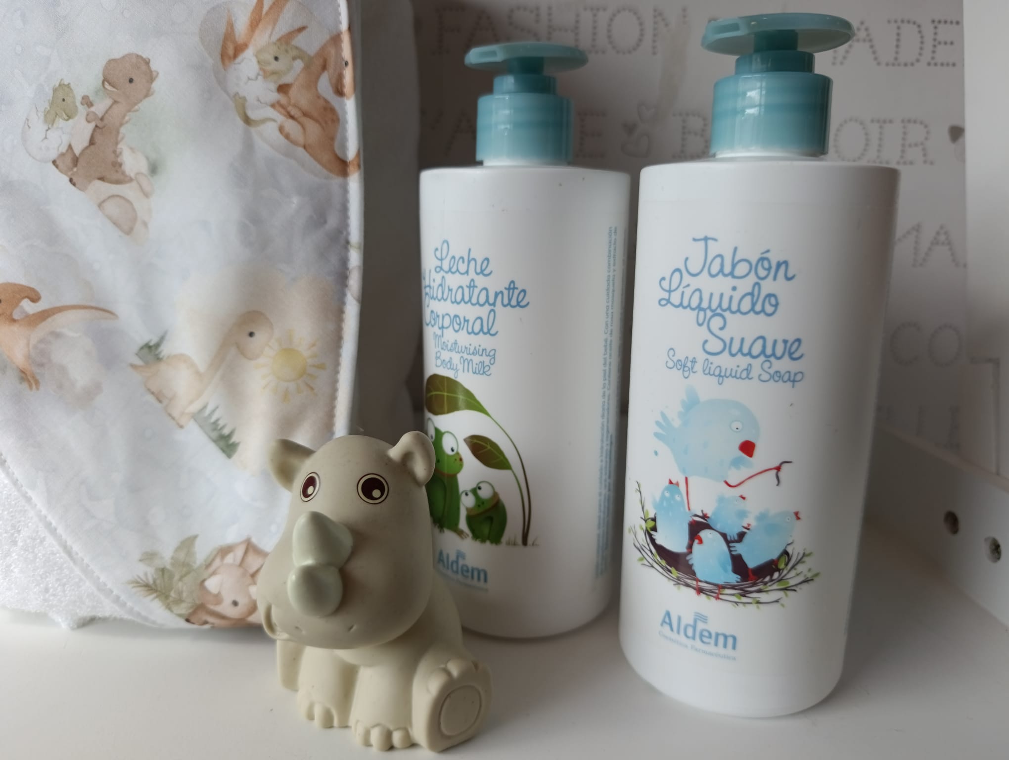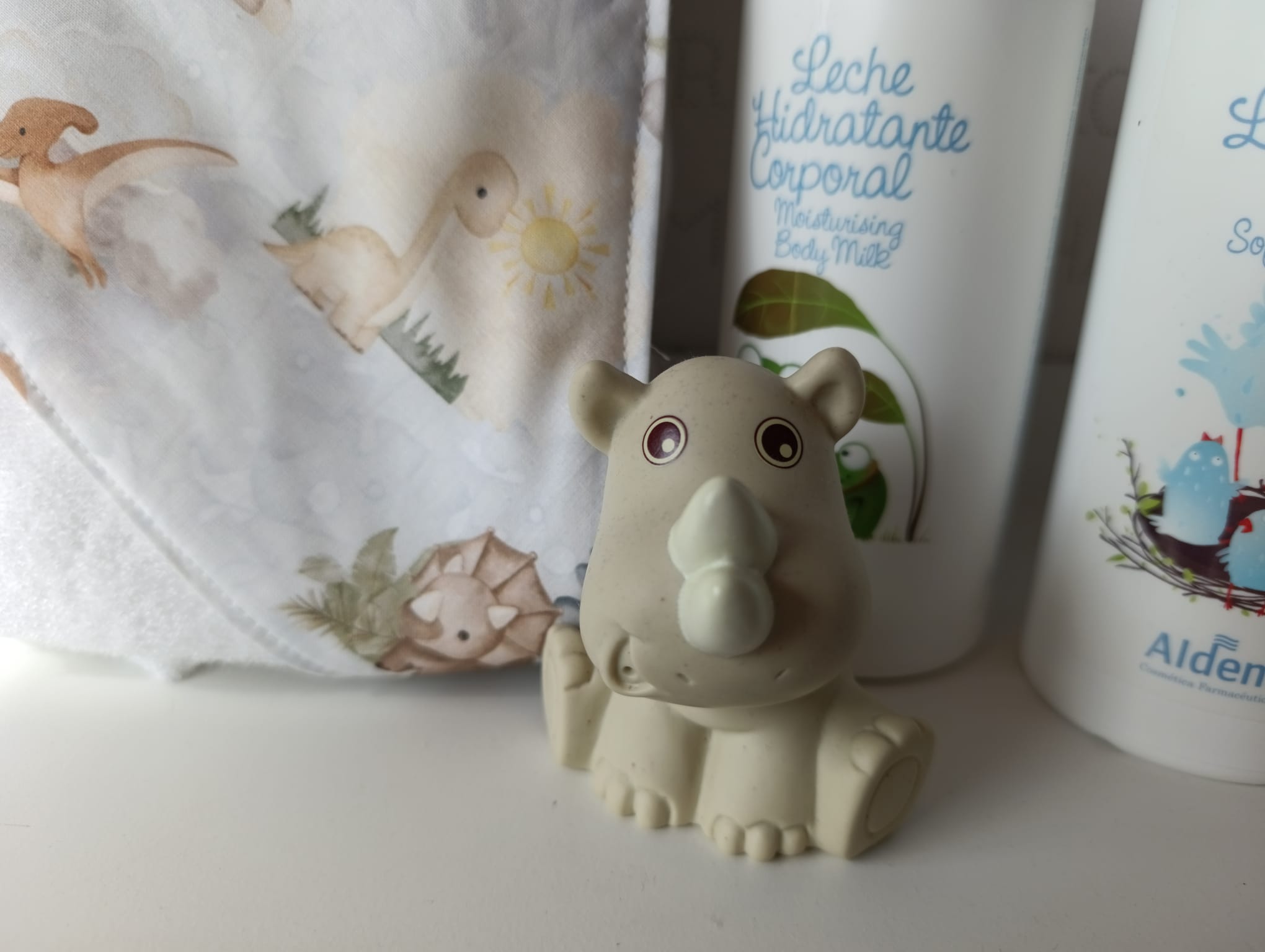 Acompañan el set un gel y una crema hidratante de la marca Aldem, elaborados con tensioactivos procedentes del aceite de coco, especialmente indicados para pieles sensibles y delicadas, y un juguete de baño anti moho, divertido y seguro, para hacer del baño un momento feliz.