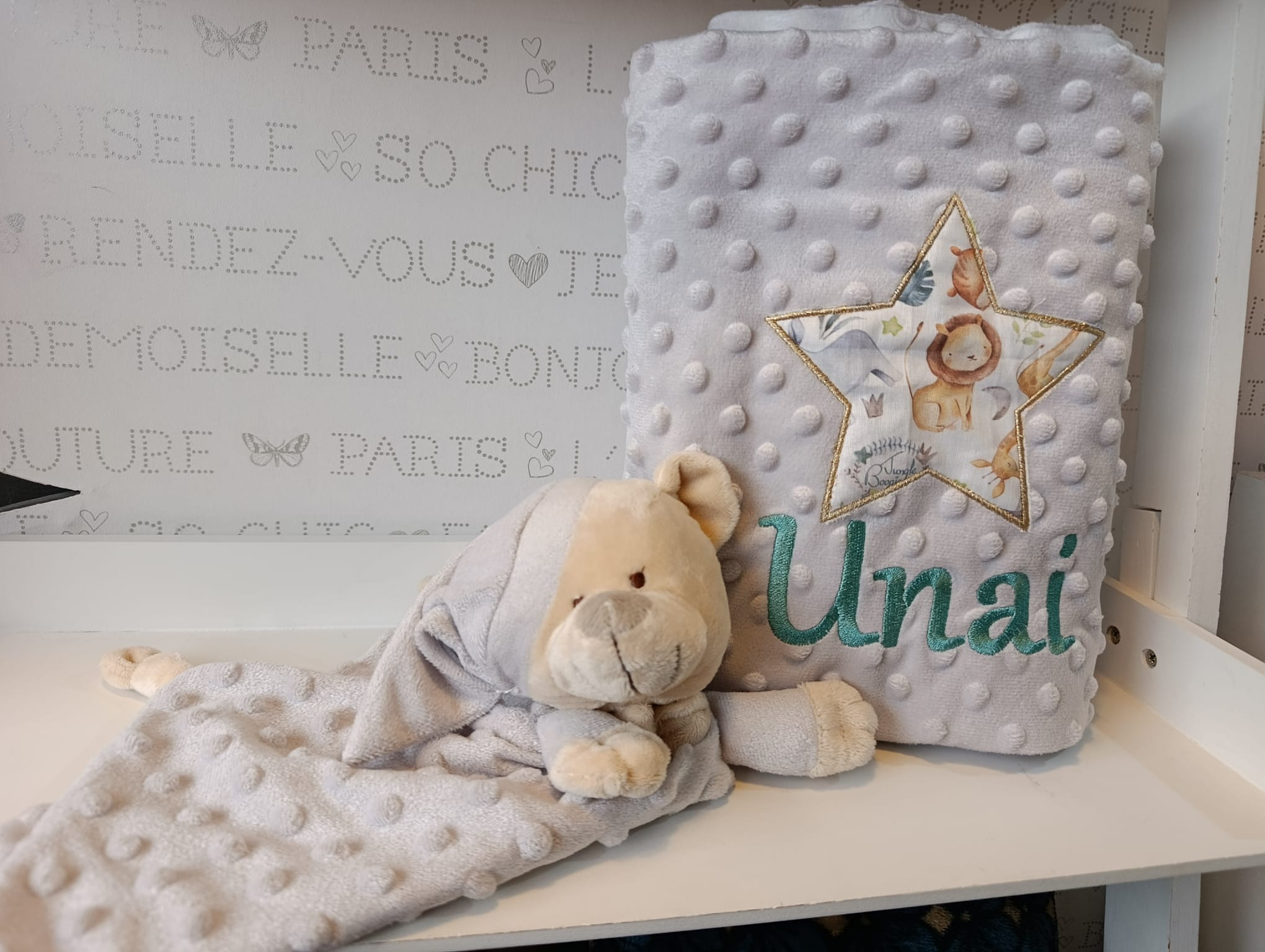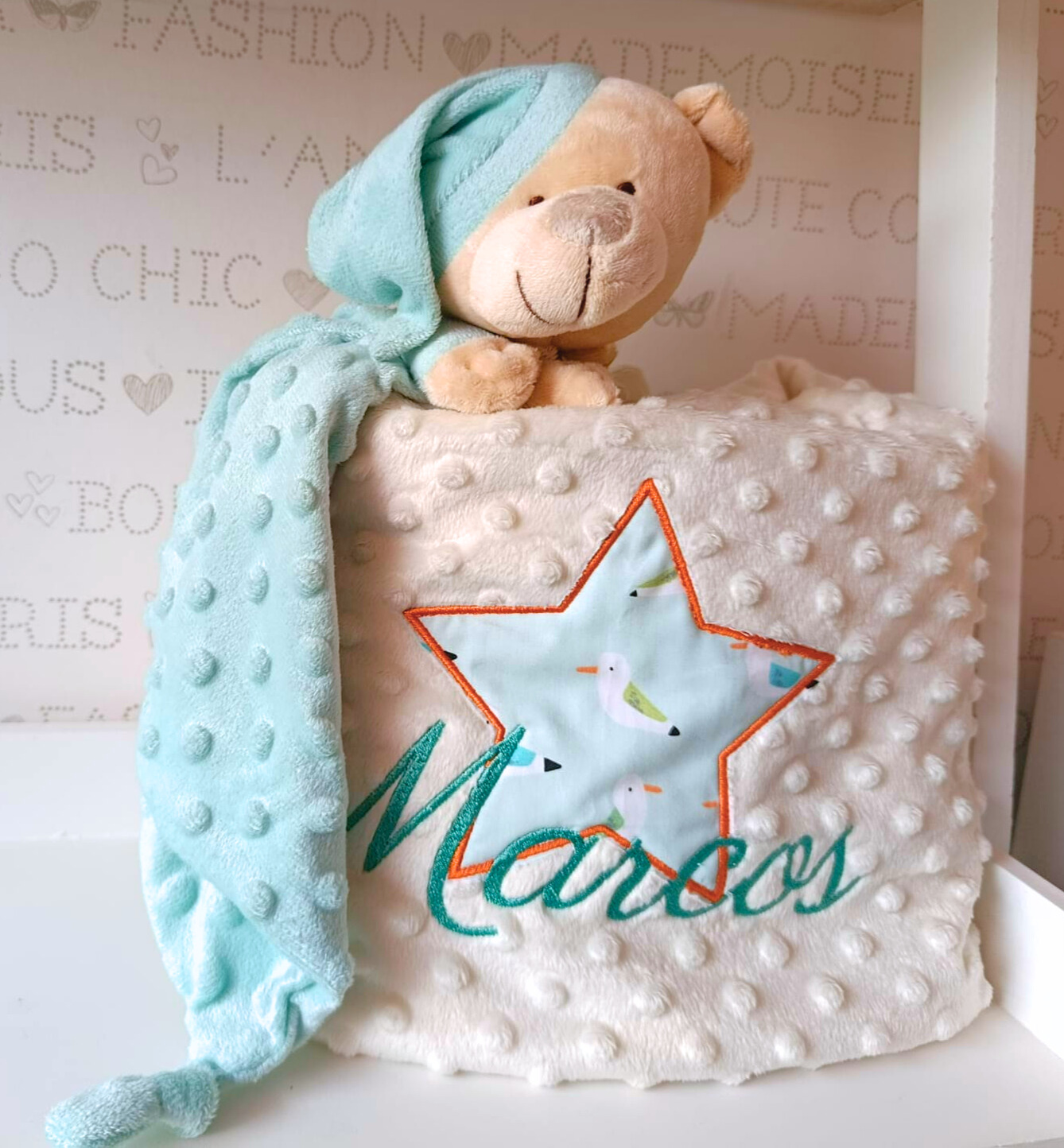 El doudou a juego, también personalizable con el nombre, se convierte en su compañero inseparable: suave, ligero y lleno de ternura, ideal para aportar tranquilidad en cada abrazo. 🤍