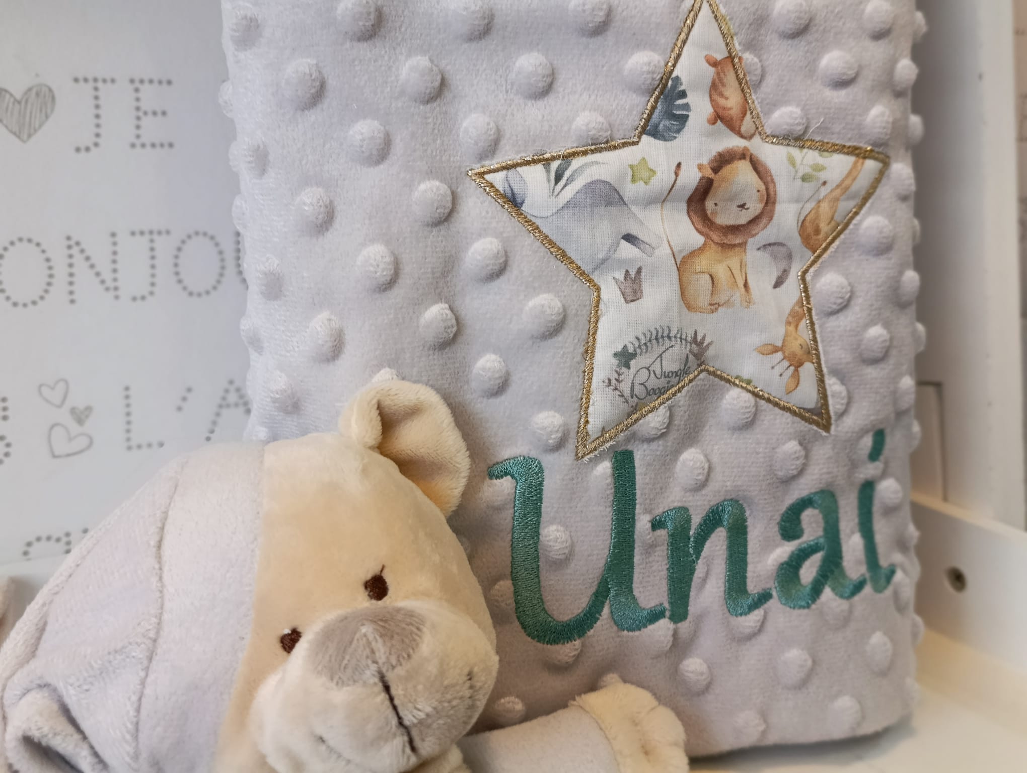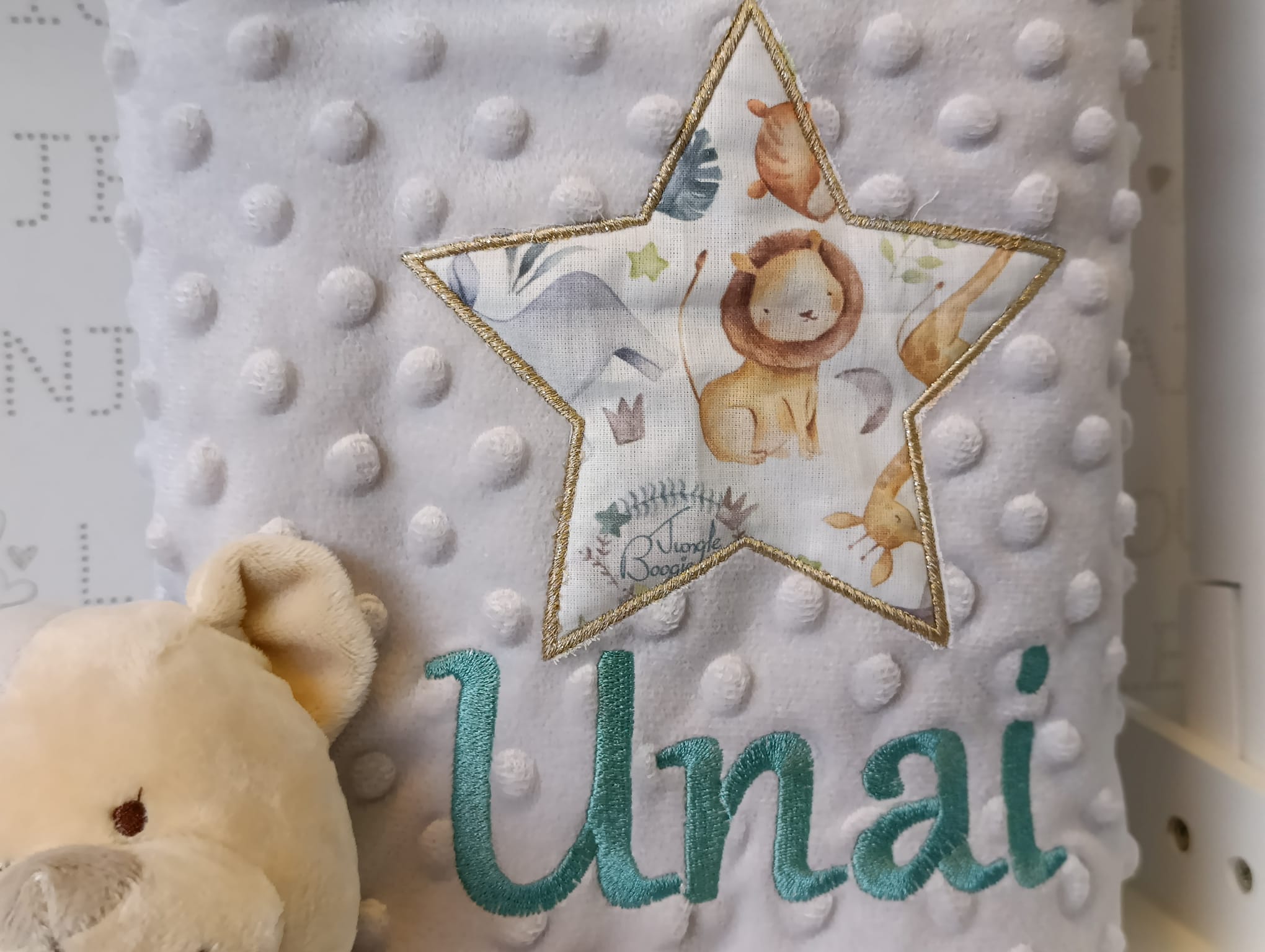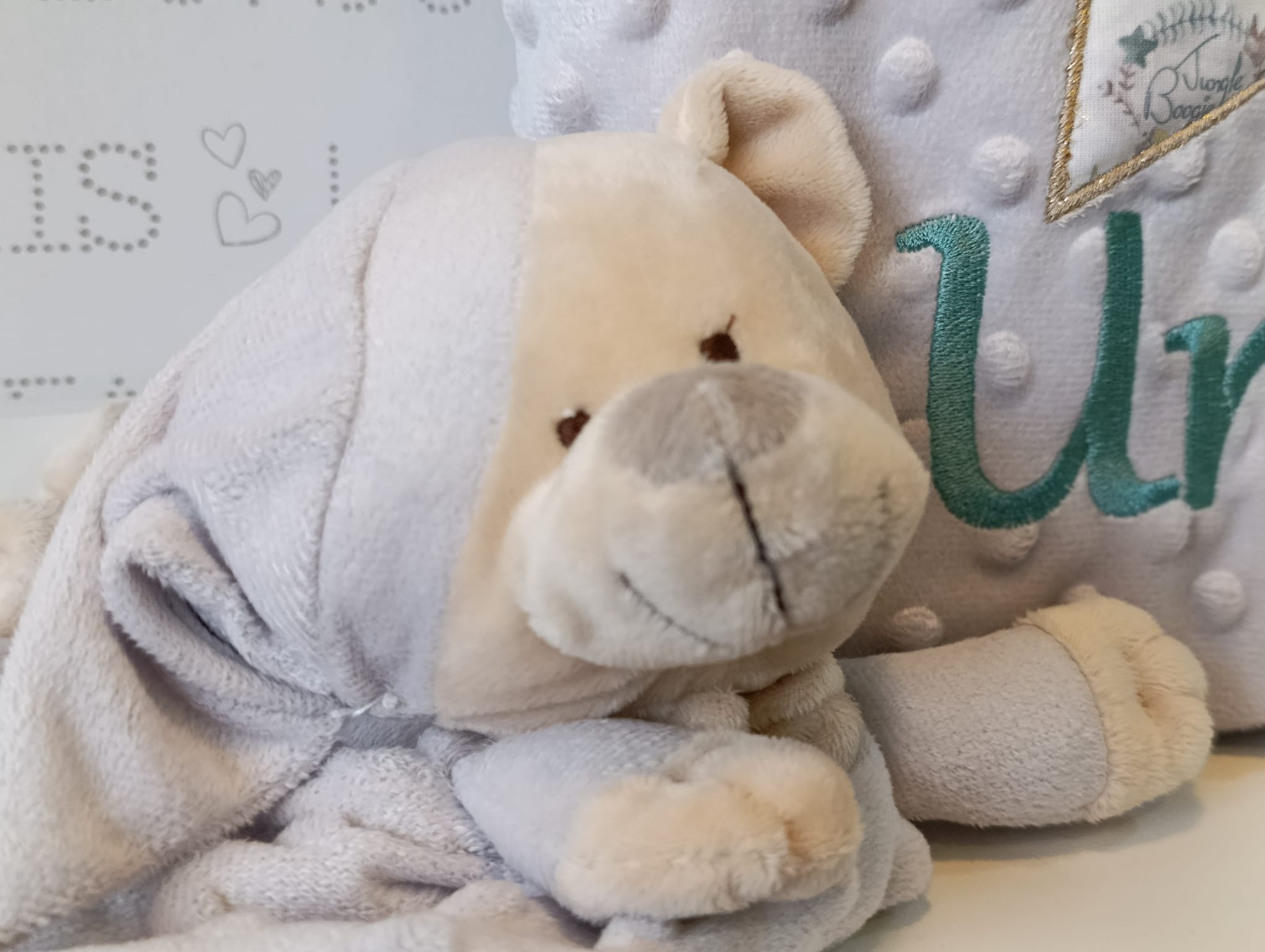 El doudou a juego, también personalizable con el nombre, se convierte en su compañero inseparable: suave, ligero y lleno de ternura, ideal para aportar seguridad en cada abrazo.