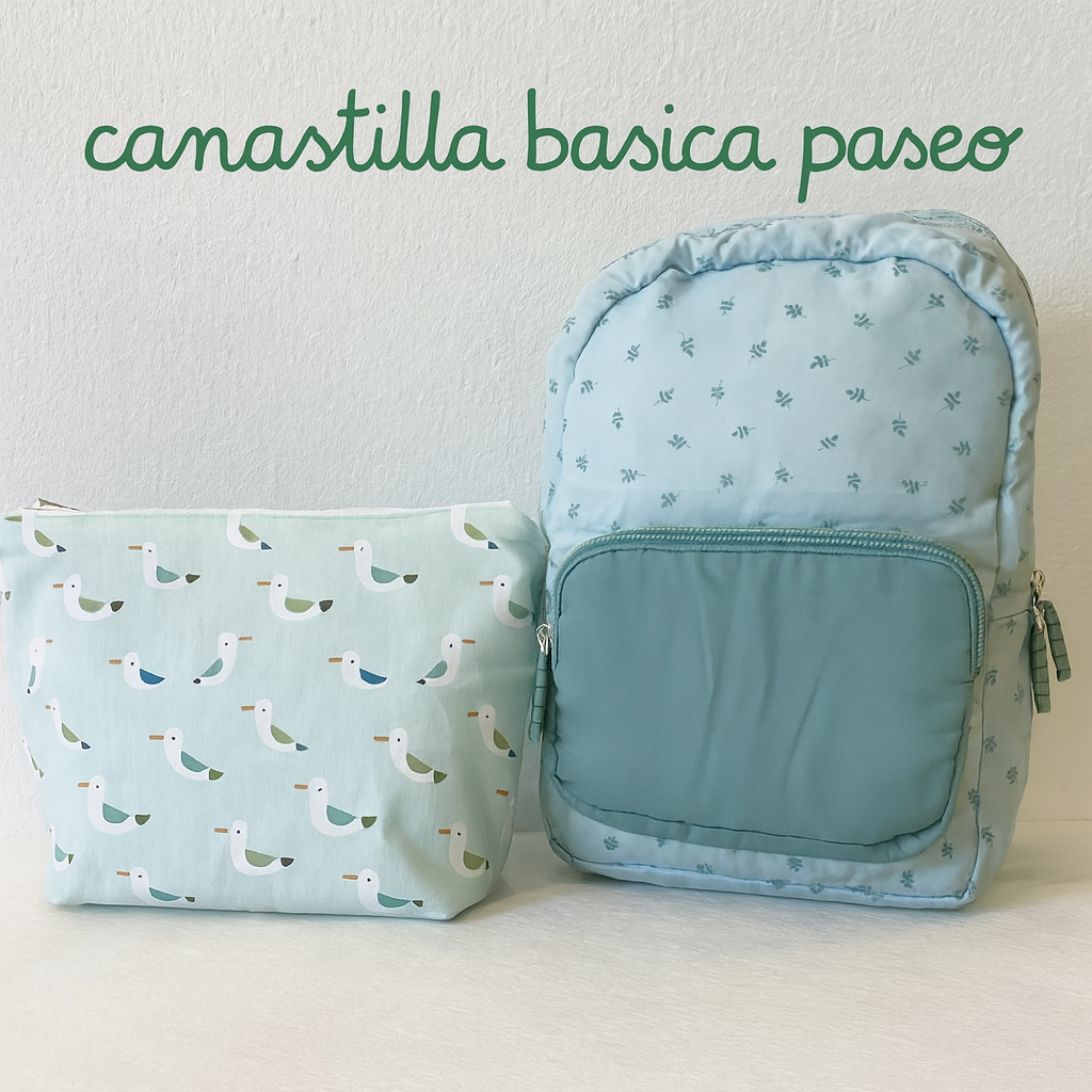 Incluye una mochila y un neceser confeccionados a mano en nuestro taller, eligiendo cuidadosamente cada tela para conseguir ese equilibrio entre suavidad, color y resistencia.