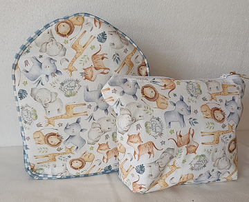 Incluye mochila y neceser artesanales, confeccionados a mano con telas suaves y estampados de leones, jirafas y elefantes. 🦁🦒
