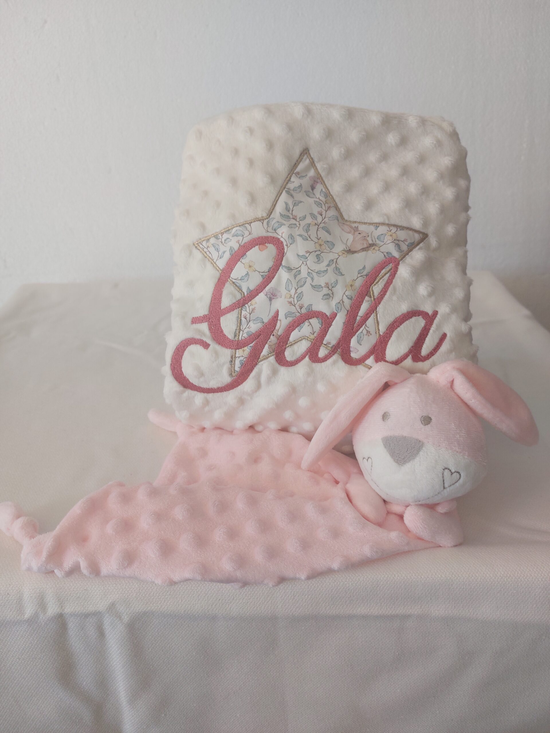 Incluye una manta artesanal y un doudou personalizado, confeccionados con tejidos suaves y respetuosos con la piel del bebé.