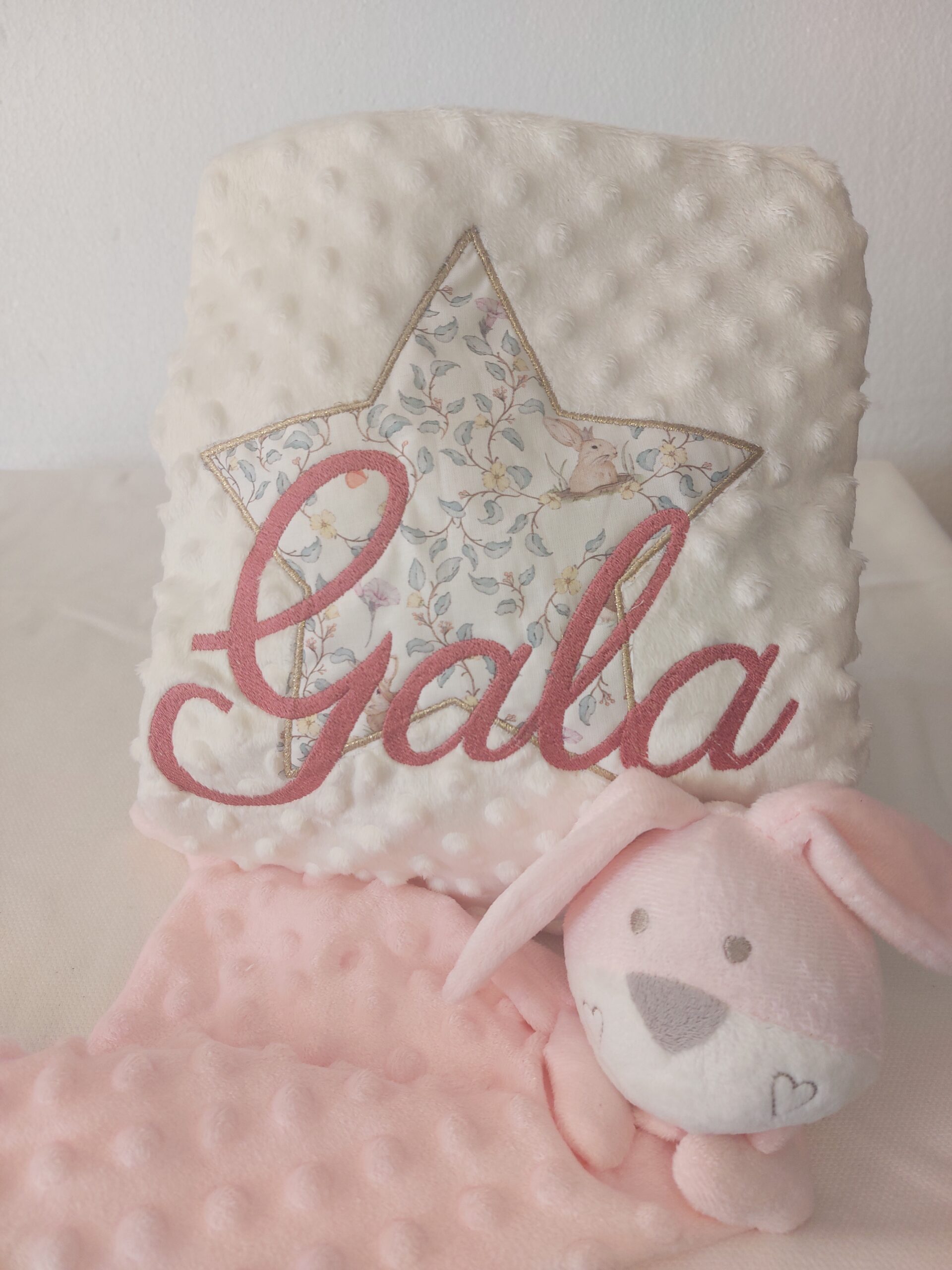 Incluye una manta de la Colección Bimba, confeccionada a mano en nuestro taller con tejidos suaves y delicados, perfecta para acompañar sus siestas, juegos y sueños más dulces. El doudou a juego, también personalizable con el nombre, se convierte en su compañero inseparable, ideal para aportar calma y ternura en cada abrazo.