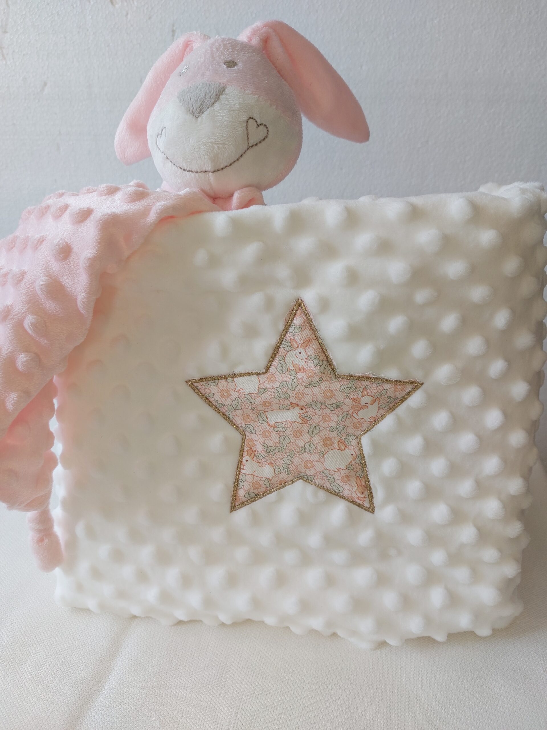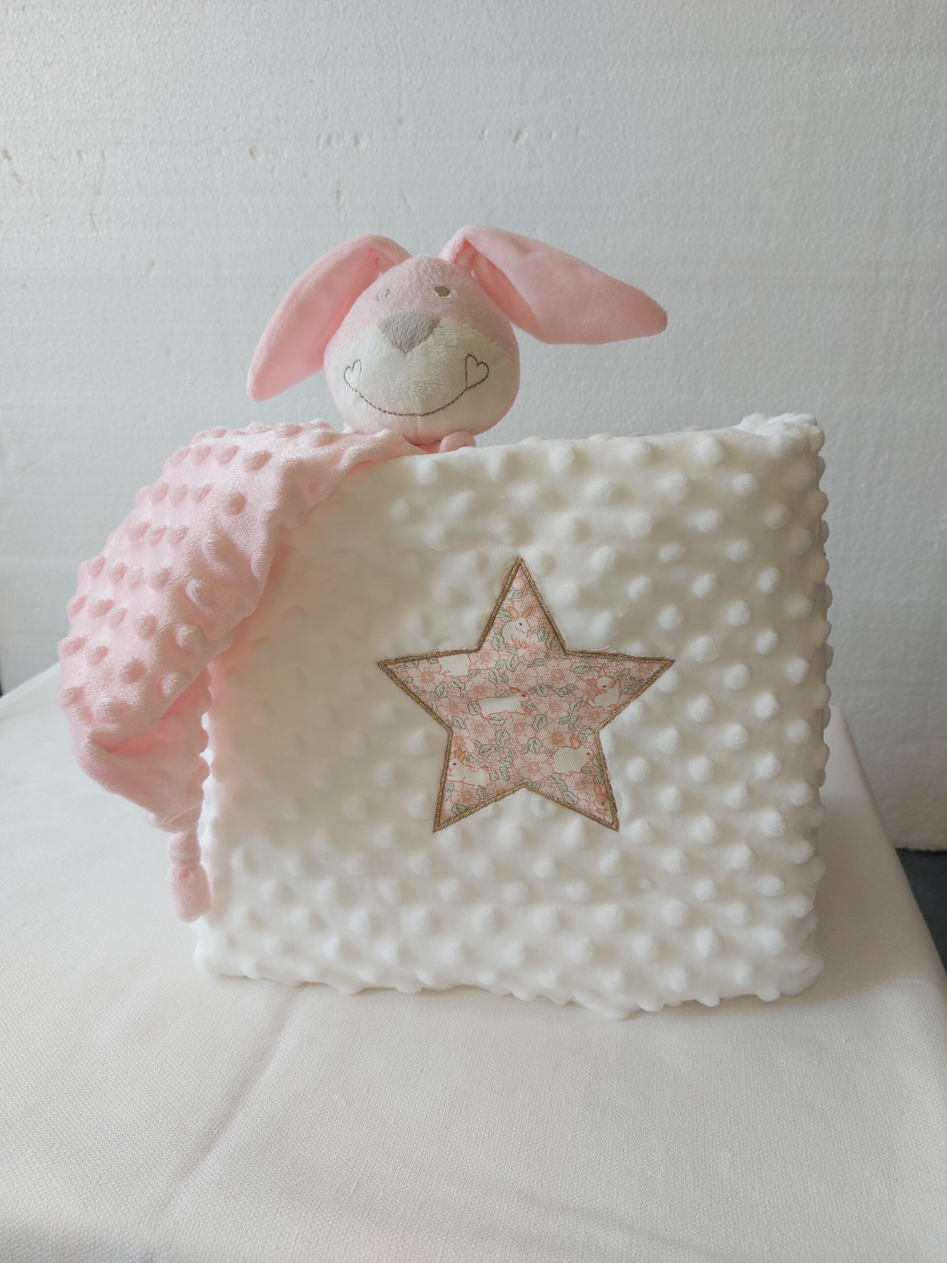 Incluye una manta artesanal personalizada con el nombre del bebé y un dou dou conejito a juego, suaves y de gran calidad.