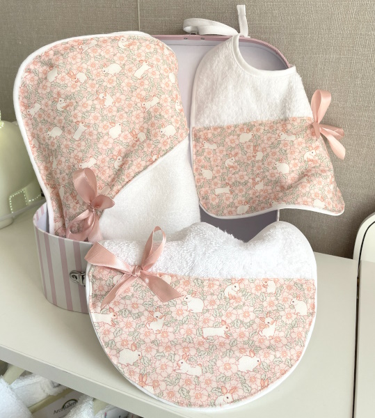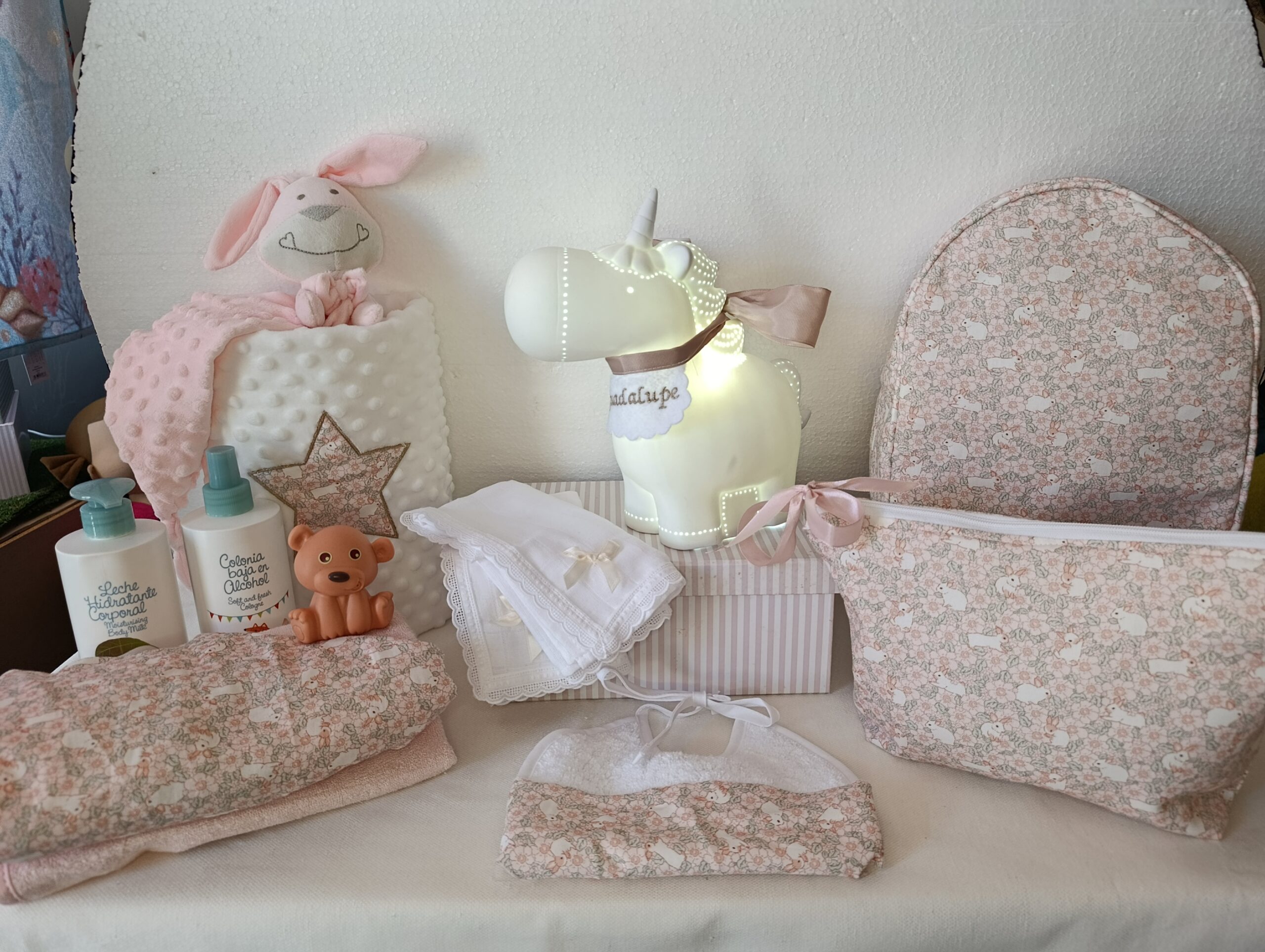 Incluye mochila, neceser, manta burbuja, doudou conejito, babero, capa de baño, lamparita, gel, crema hidratante y juguete de baño antimoho, todo coordinado en los tonos más delicados de la colección.